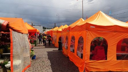 Der Senatsplatz – Helsinkis Hot-Spot – ist bei meinem zweiten Besuch am Tage von Touristenbussen umstellt und Menschenmassen bewegen sich über den Platz und die Treppen zum Dom hinauf. Auf dem Markplatz am Südhafen leuchten die orangen Pavillons der Händler in der Sonne. Hier gibt es von Obst und Gemüse über Souvenierkitsch bis zu traditionellen finnischen Handwerksprodukten alles. In der historischen Markthalle stärken sich Einheimische und Urlauber bei allerlei Delikatessen. Beim Anblick von Lachs im Kräutermantel, Sandwich mit Rentierschinken oder den vielen süßen Kuchen läuft auch mir das Wasser im Mund zusammen. Natürlich probiere ich das Rentier-Sandwich für fünf Euro. Es schmeckt lecker, doch einen großen Unterschied zu anderen Schinkensorten erkenne ich nicht.